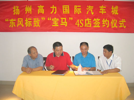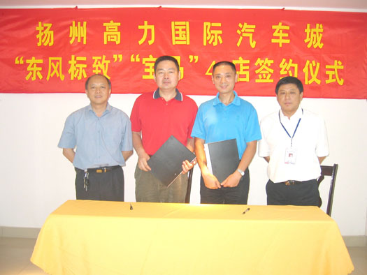 2007年7月18日,揚(yáng)州高力國(guó)際汽車城與揚(yáng)州金鑫房地產(chǎn)公司在揚(yáng)州分公司四樓會(huì)議室舉行了“東風(fēng)標(biāo)致”、“寶馬”4S店簽約儀式,總經(jīng)理陳利平、集團(tuán)商管中心孫志明副總參加了此次簽約儀式。